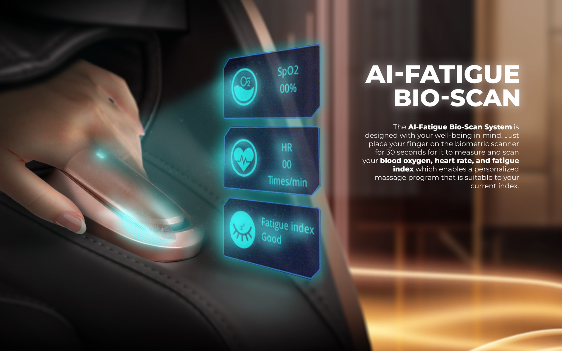 - Measure and scan user’s heart rate, blood oxygen and detects up to 3 levels of fatigue index for a personalized massage program.