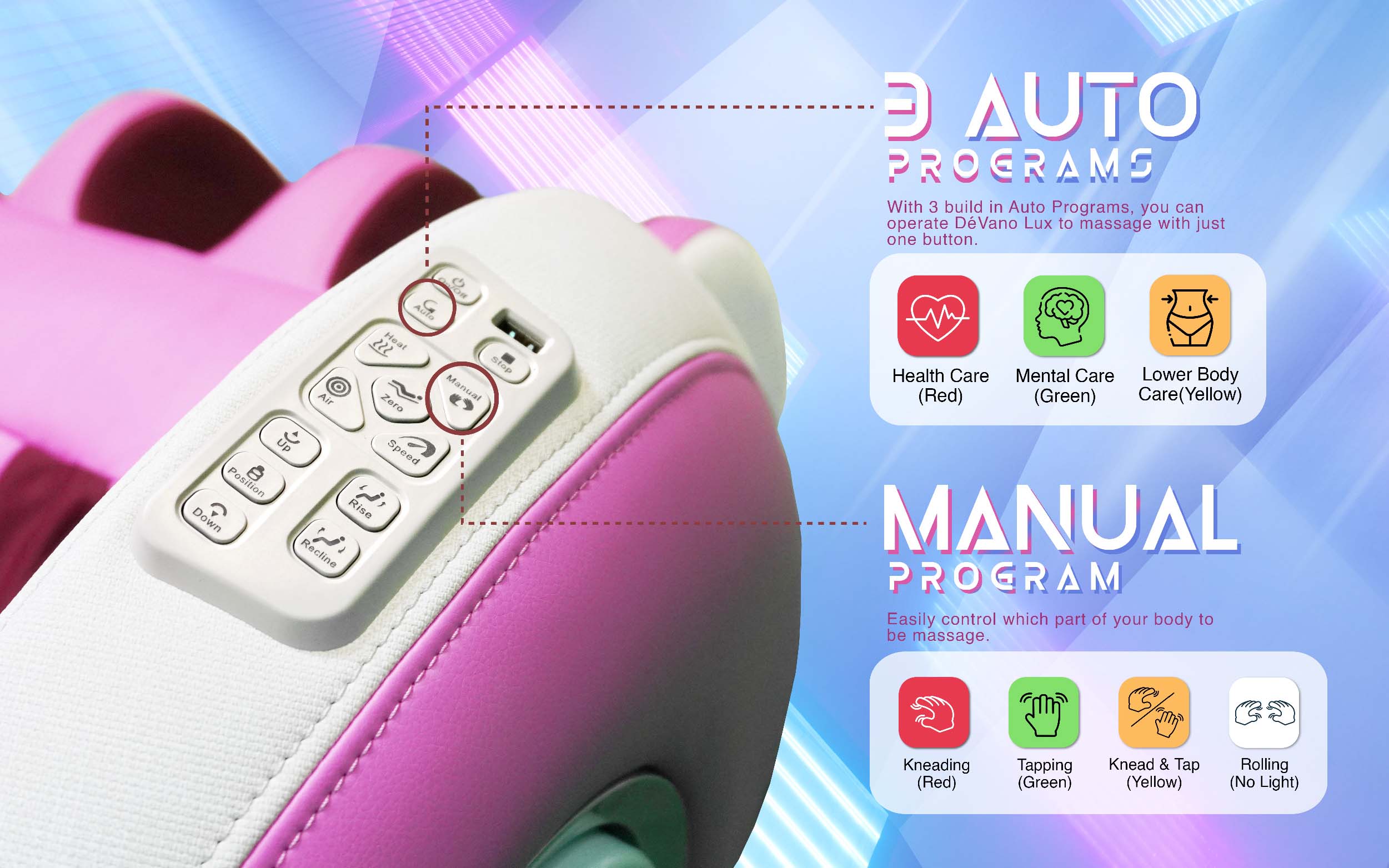 - You can massage with its 3 especially built-in auto programmes with just one button